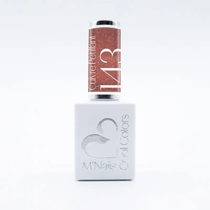 Le vernis semi permanent ultra-pigmenté et Soak Off Cuivre Pétillant dévoile une teinte cuivrée, parsemée de fines paillettes dorées et sublimée par de subtils sous-tons marron.